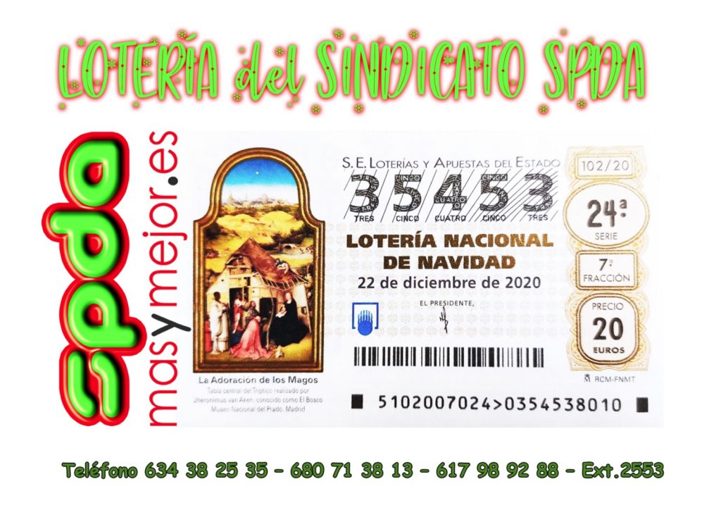 El Sindicato S.P.D.A. como de costumbre pone a la venta el décimo de la LOTERÍA de NAVIDAD 2020 correspondiente al número 35.453